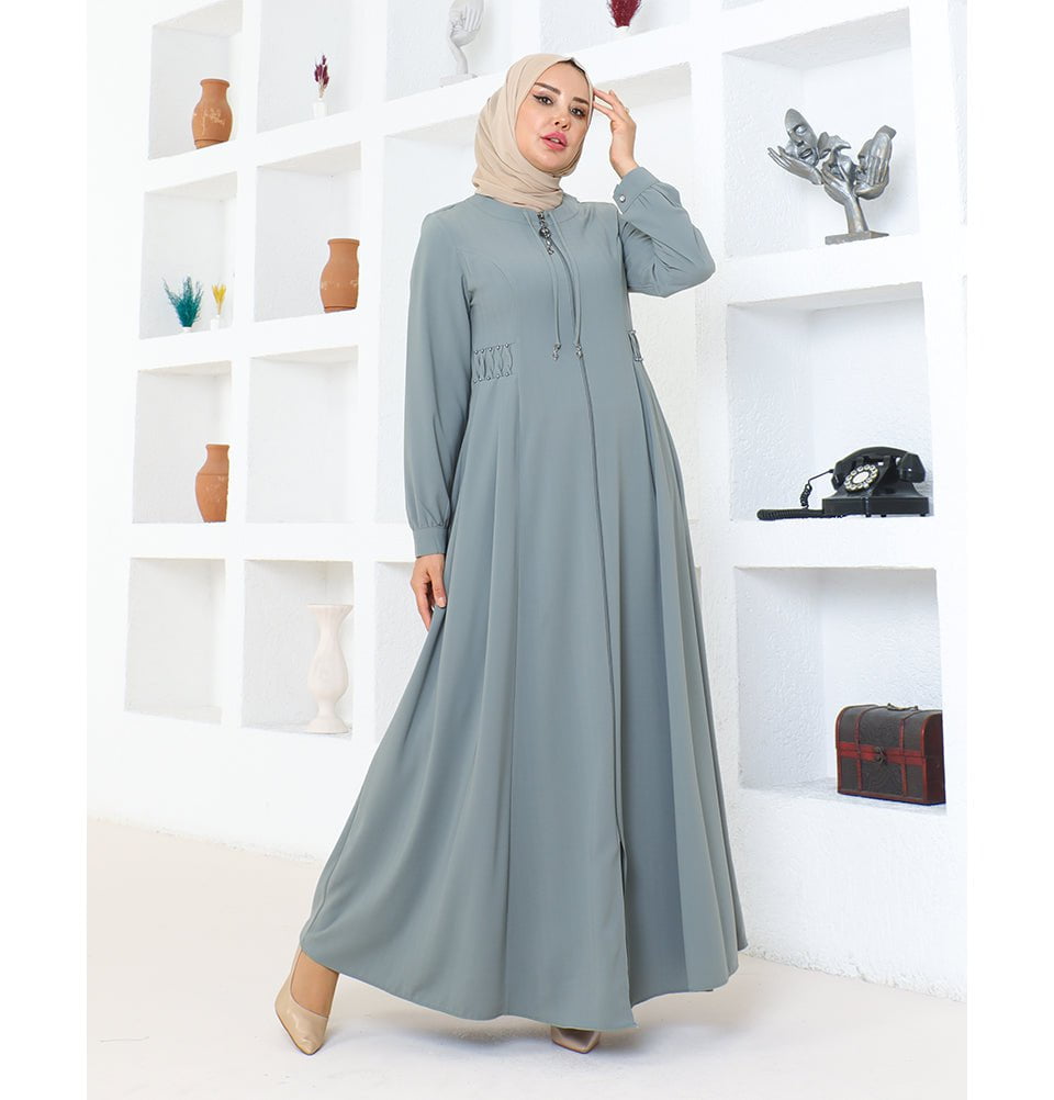 Modest Muslim Woman Pearled Twist Zip Up Abaya - 1113 Grey hijab fashion abaya