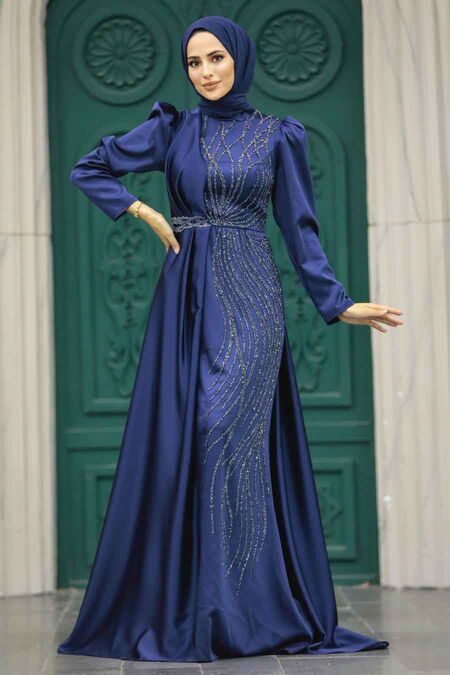 Luxury Navy Blue Hijab Wedding Dress 23221L - Neva-style.com long sleeve hijab modern wedding dress