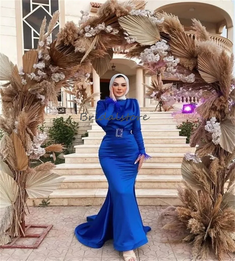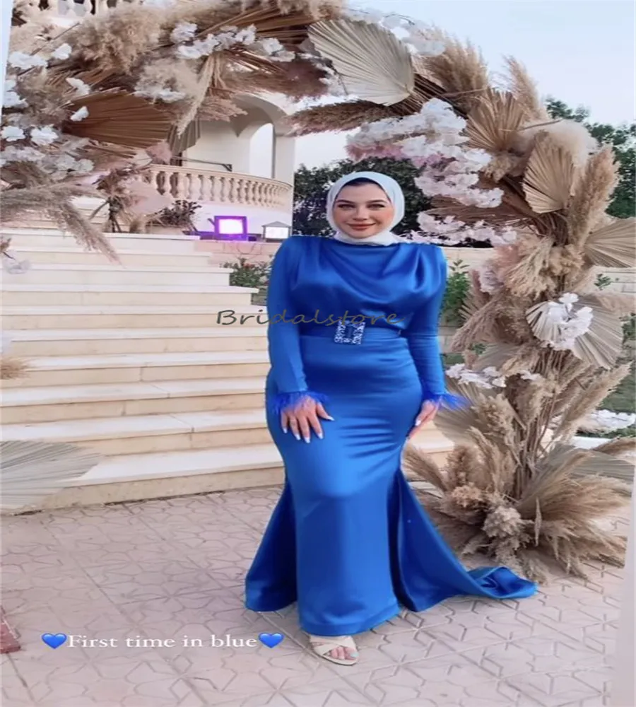 Gown Hijab Mermaid Costume Mermaid Muslimah Luxury Muslim Mermaid Evening Dress With Overskirt: Royal Blue Feather dress mermaid hijab