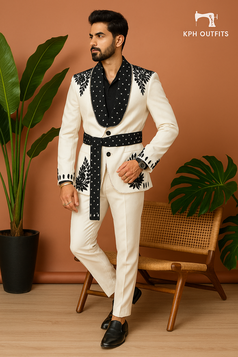 Men's Exclusive Ivory Handcrafted Belt Style Tuxedo Suit – Luxury Form – Kph Outfits - Royal Clothing mens suit with waist belt