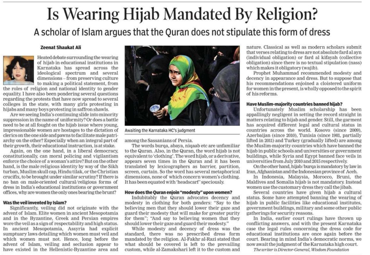 Is wearing Hijab mandated by Religion? - Zeenat Shaukat Ali, a scholar of Islam, argues that the Quran does not stipulate this form of dress. Must read this piece which shatters the no mention of hijab in quran