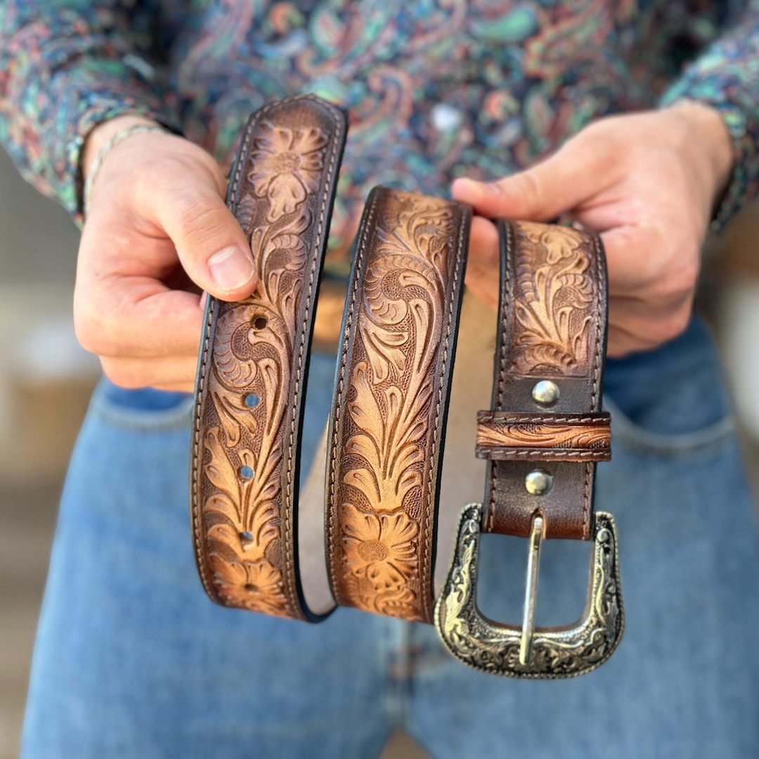 Custom made beautifully embossed leather belt with intricate floral designs.Idle for designers at ₹ 500/piece | Beaded Leather Belts in Mumbai | ID: 2855184792133 custom made belt
