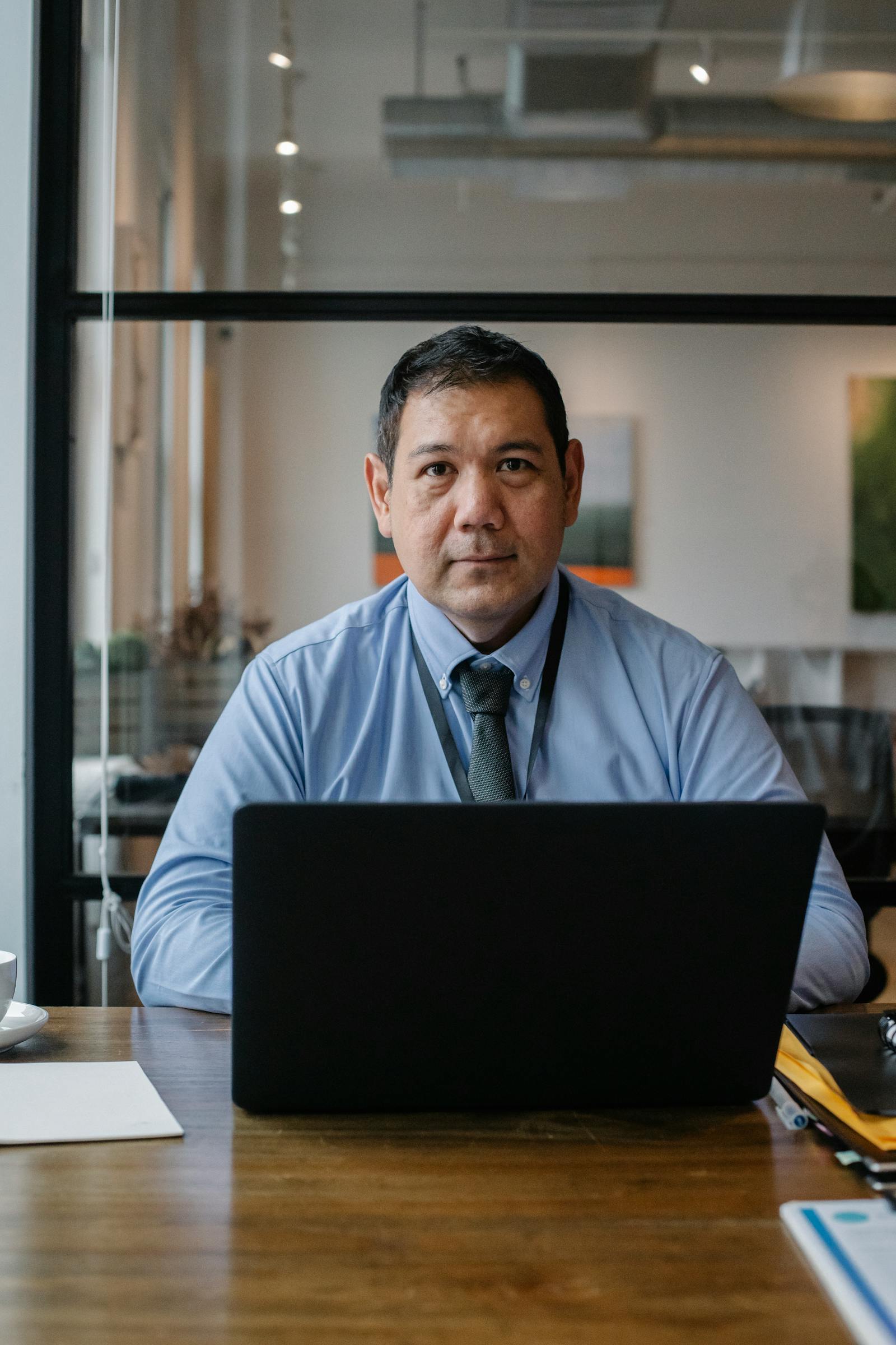 Happy African American CEO in a suit standing at modern office looking at camera in front of ceo jordan 16